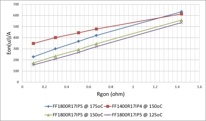 圖2:不同開(kāi)通電阻下IGBT開(kāi)通脈沖損耗