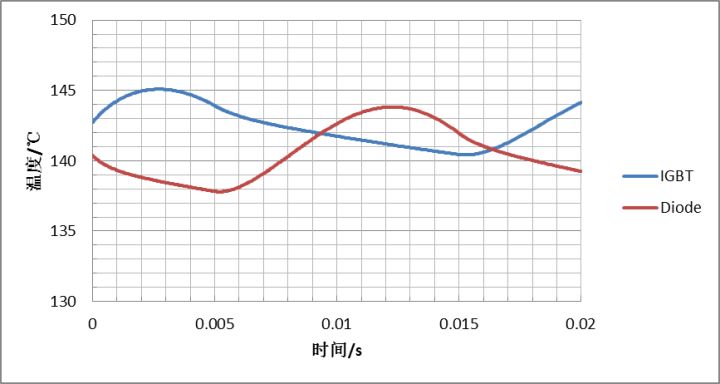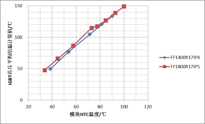 圖7:IGBT芯片平均結(jié)溫計(jì)算值與模塊NTC溫度顯示值的關(guān)系曲線