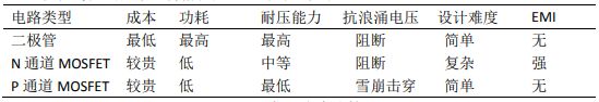 上面的三種方案,小電流的時候可以使用二極管,成本低廉,電路簡單,但是在電流增加的情況下發(fā)熱會越來越嚴(yán)重;這時候可以用 MOSFET 電路來代替,使用 N 通道或者 P 通道,主要要考慮的因素是價格以及 EMC 效果,見表 1。