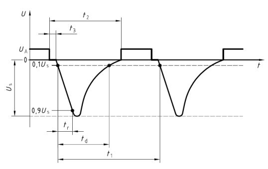 由于 tr 相對 td 時間很短,只有微秒級,可以假定這個波形是個理想的直角三角形,橫坐標(biāo)持續(xù)時間 td(2ms),縱坐標(biāo)峰值為 Us(-100V)。同時負(fù)載在標(biāo)準(zhǔn)中規(guī)定為 10Ω。