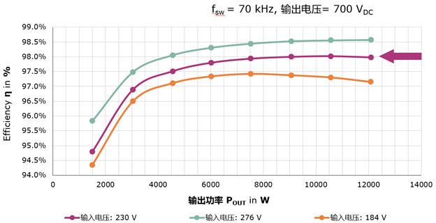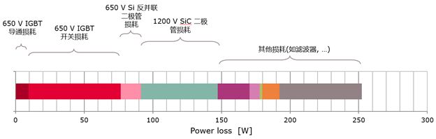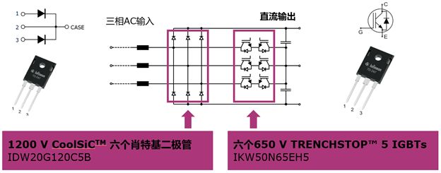 本文介紹一種基于”T”型三電平演化而來(lái)的Vienna整流器,以及怎樣使用英飛凌新一代650 V單管IGBT和1200 V SiC肖特基二極管,實(shí)現(xiàn)系統(tǒng)高效率和高功率密度。如下圖1,是經(jīng)典的”T”型三電平Vienna整流器拓?fù)鋱D,整流部分采用1200 V SiC 二極管, 鉗位開(kāi)關(guān)管采用2顆650 V IGBT 反向串聯(lián),并連接BUS 母線中點(diǎn)。