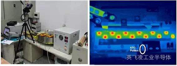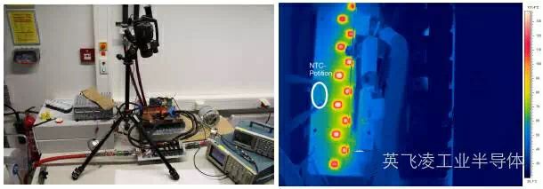 圖1:左-測溫試驗臺,由IGBT模塊,電源,數(shù)據(jù)采集系統(tǒng),冷卻設(shè)備和測溫設(shè)備組成 右-被測IGBT模塊的紅外圖像,只加熱二極管芯片