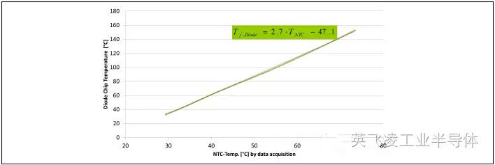 圖2中的非線性曲線需要用3次多項式插值才能準確描述。NTC電阻的特性參數(shù)通常由半導(dǎo)體的規(guī)格書給出,所以可以很容易的把NTC電阻值轉(zhuǎn)換成對應(yīng)的溫度值。用NTC電阻的溫度替換圖2中的NTC電阻值,便可得到NTC電阻溫度和芯片溫度的線性對應(yīng)關(guān)系tdiode=f(TNTC),如圖3所示。