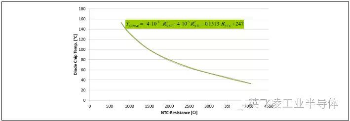 借助數(shù)據(jù)處理工具,比如Excel,對測量的NTC電阻[Ω]和二極管溫度[℃]進行校正,便可得到兩者的對應(yīng)關(guān)系tdiode=f(RNTC),見圖2,其中還包括相應(yīng)的多項式插值公式。