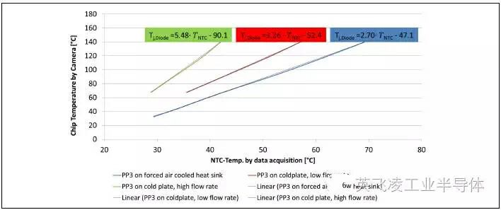 熱測試結(jié)果表明,芯片和NTC電阻之間的溫度差隨冷卻系統(tǒng)性能的提升而增加,所以對于不同的系統(tǒng)應(yīng)用工況,無法給出通用的芯片-NTC電阻溫度曲線。