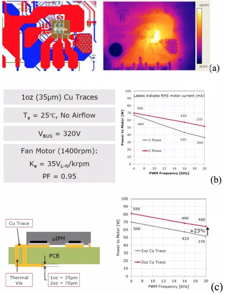 圖4 (a)PCB布局和熱成像儀測量結(jié)果(b)PCB敷銅為1盎司時最大電機功率(c)PCB敷銅為1盎司時增加電機功率當使用PCB敷銅為2盎司時,可以獲得更大輸出電流。同樣采用6kHz的開關(guān)頻率,此時IPM的電流能力從500mA增加到580mA,同比增長16%。如果開關(guān)頻率為20kHz,模塊電流輸出能力可從370mA增加到460mA,增加23%。