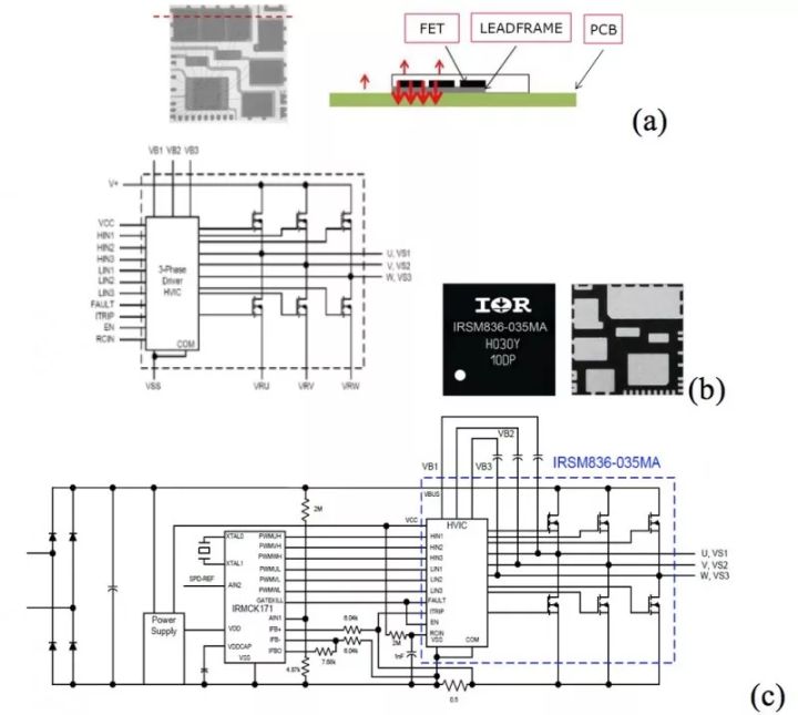 英飛凌的小型3相CIPOSTM Nano IPM系列產(chǎn)品(12 x 12 x 0.9 mm3)因其優(yōu)異的散熱特性而被這類電機所采用,該產(chǎn)品將一個6通道柵極驅(qū)動器和6個MOSFET集成在同一個封裝內(nèi),如圖3(b)所示。