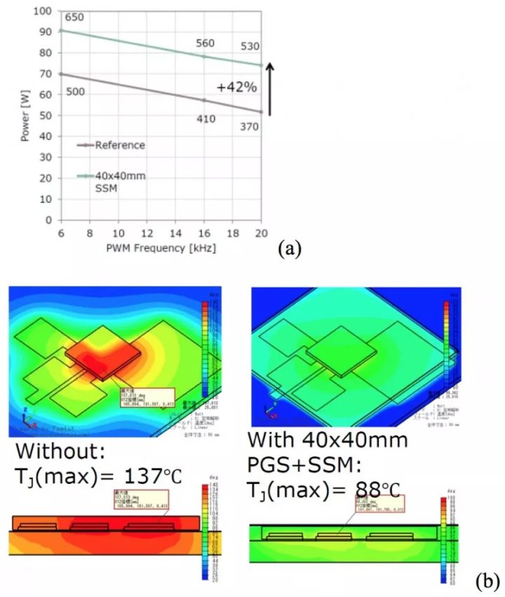 圖5 (a)采用絕緣散熱膜PGS+SSM后的最大輸出功率(b)使用絕緣散熱膜后結(jié)溫從137℃降低到88℃如圖5(b)所示,在PCB板上使用40x40mm2絕緣散熱膜時,模塊結(jié)溫從137℃降至88℃。此時在6kHz的開關(guān)頻率下,模塊電流能力可從500mA增加到650mA,相對增加30%。而在開關(guān)頻率20kHz時,其電流能力可以從370mA增加到530mA,相對增加42%。